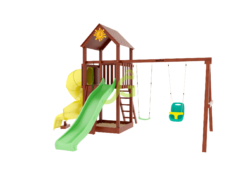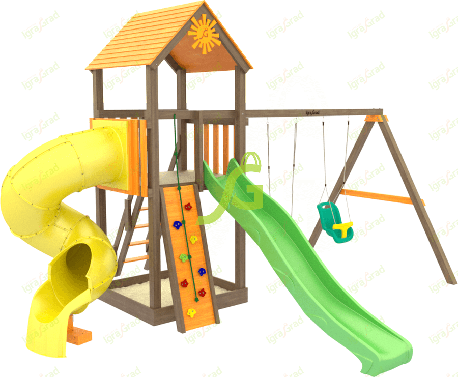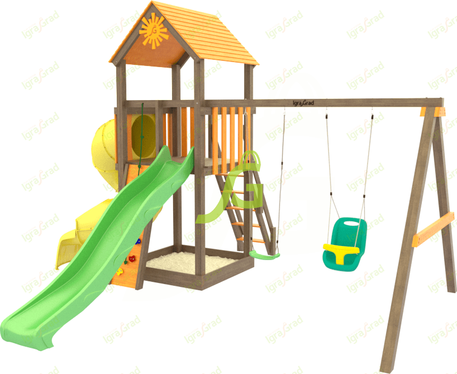 - - Песочница - расположена на первом уровне игрового комплекса и защищена деревянной крышей, поэтому игры не страшны малышу даже при палящем солнце. Опционально песочница может быть укомплектована специальной крышкой;