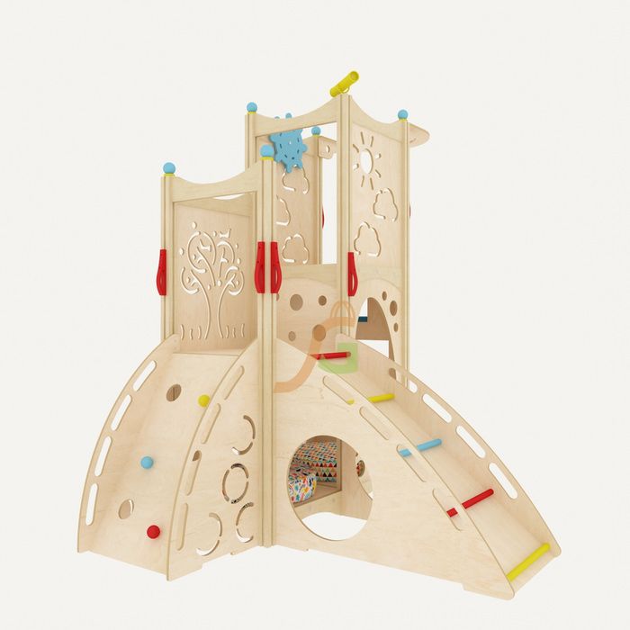 Особое внимание было уделено дизайну конструкции. Благодаря продуманному проектированию домик занимает минимум места и отличается функциональностью. Прямоугольные выемки могут выступать в качестве ступенек, через круглые отверстия малыши могут выбираться из домика, представляя, что преодолевают тяжёлый путь лабиринта.