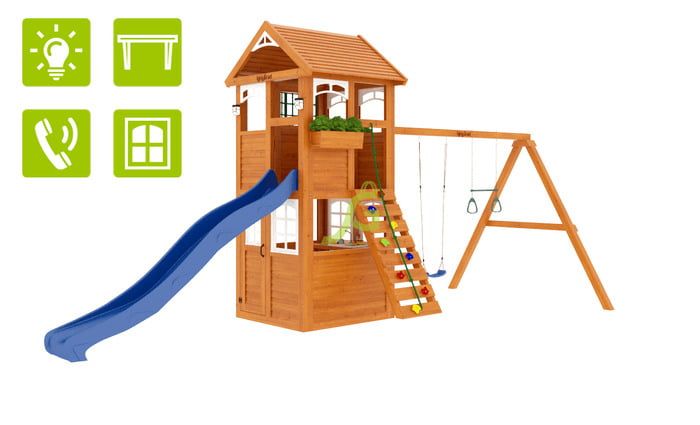 Детская площадка для дачи "Клубный домик Luxe" – это компактный вариант игровой зоны на дачном участке или небольшом дворе. Несмотря на свои скромные параметры, площадка удачно вмещает в себя двухуровневый деревянный домик с трехметровой волновой горкой, лестницу-скалодром для любителей верхолазов, любимые всеми качели, трапецию с кольцами, а также развивающую игровую доску "Крестики-нолики".