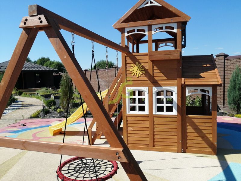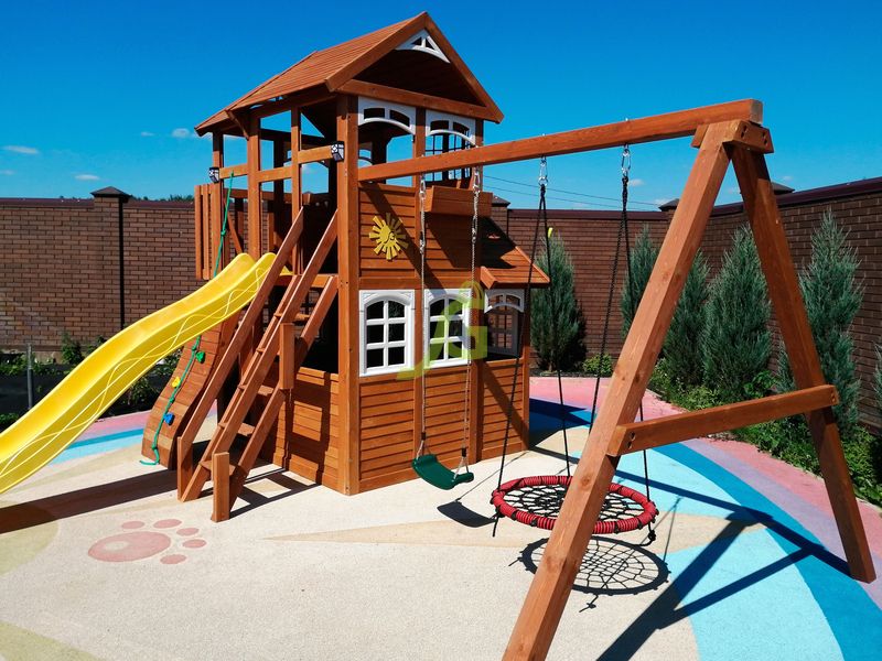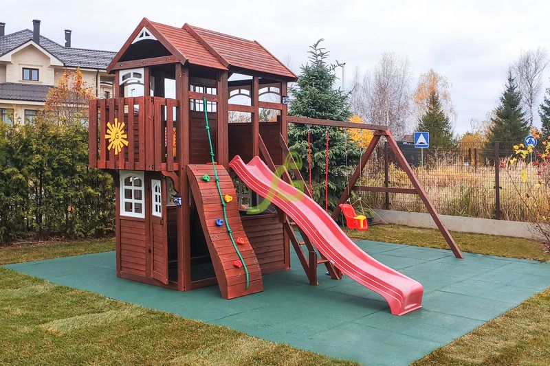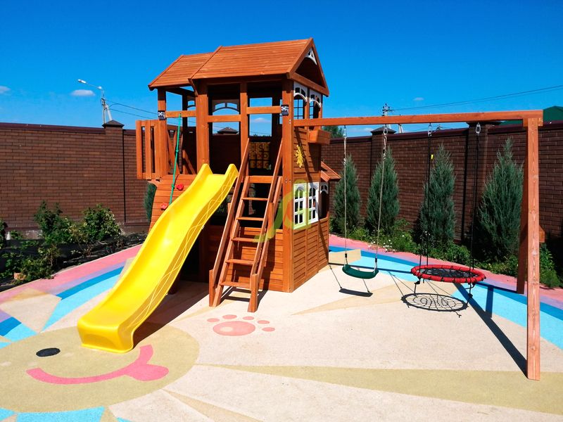 Обращаем Ваше внимание, что цвет установленной детской площадки может отличаться от представленных изображений на сайте. Специфика окраски нетоксичными пропитками допускает отклонения в цветовой гамме отгружаемых изделий вследствие различного цвета натурального природного сырья и естественных компонентов, используемых для производства площадок.