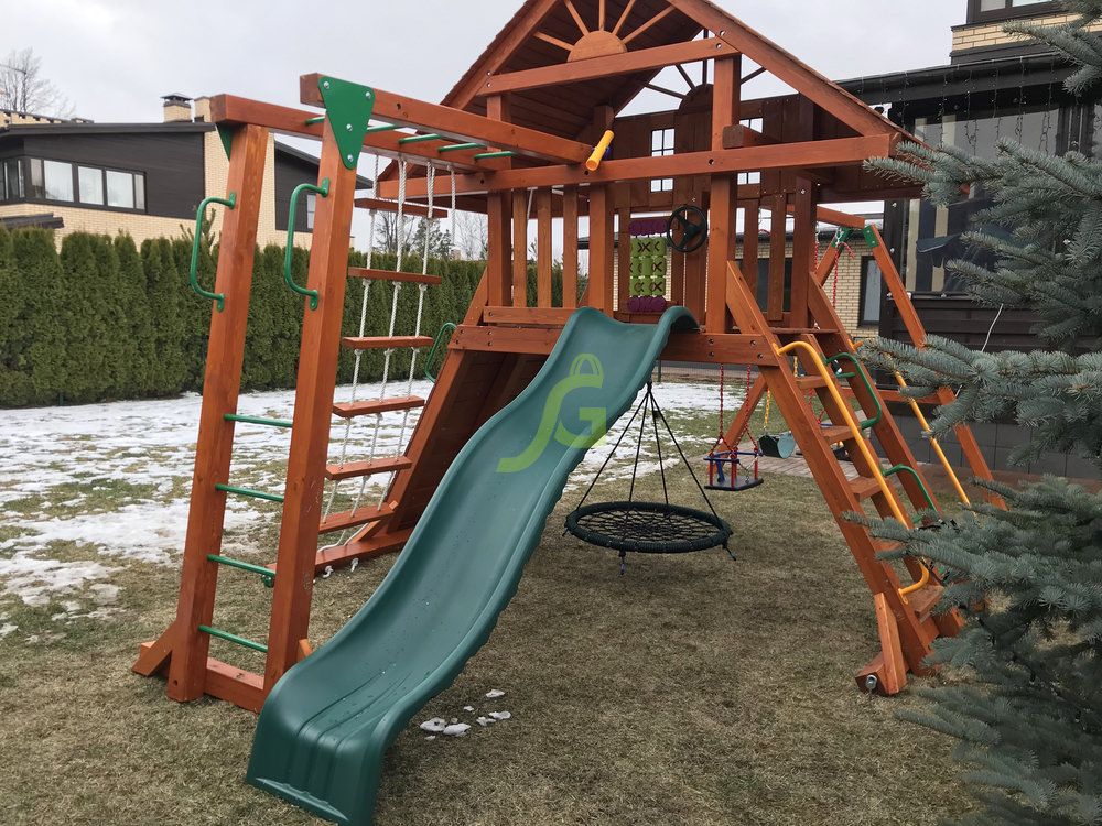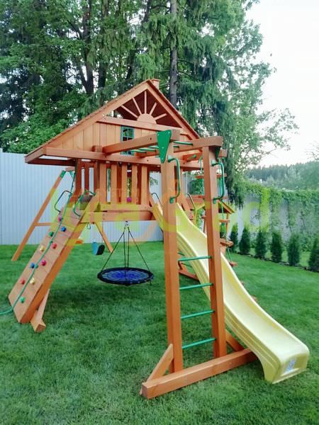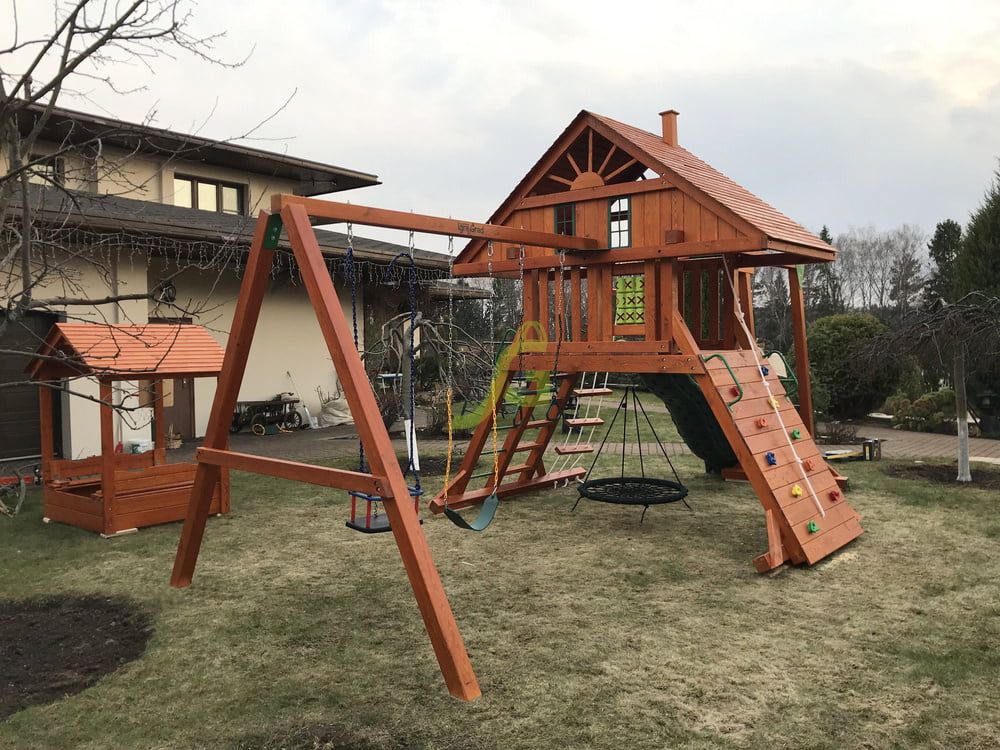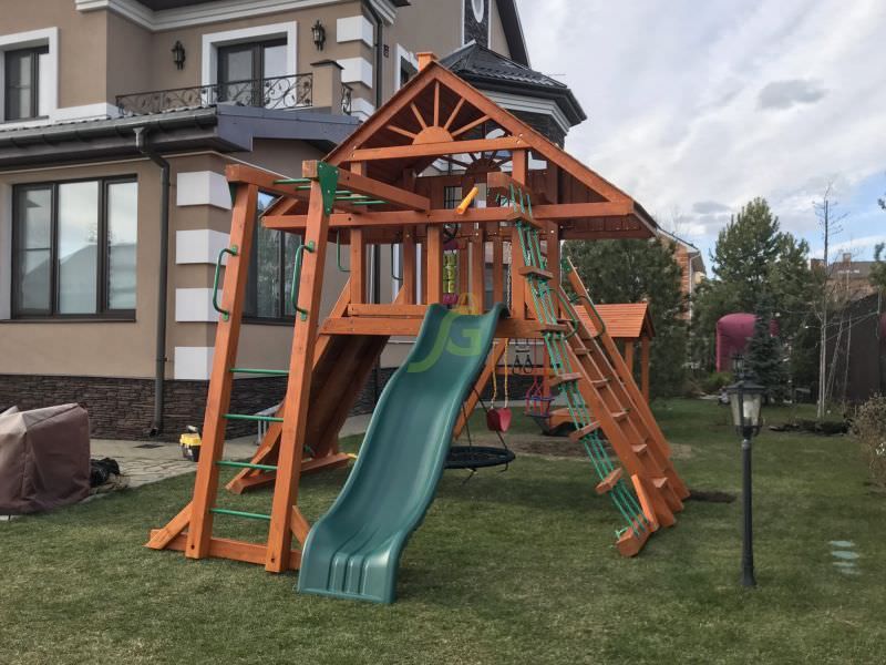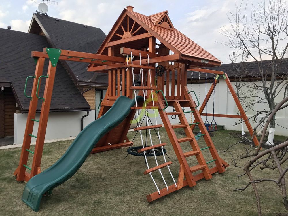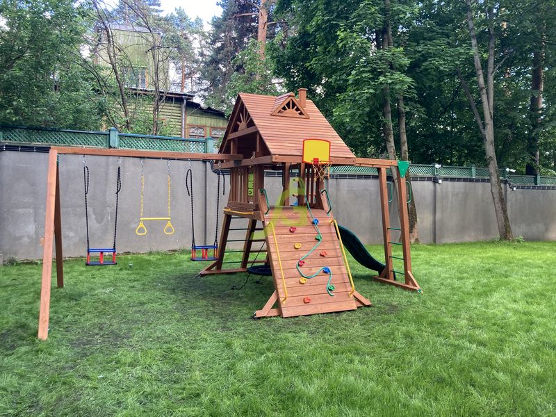 Детская площадка для дачи сконструирована в виде привлекательного домика, который оснащён крышей, трубой и даже окошками. Дизайн конструкции улучшает вид из окна и великолепно вписывается в ландшафтный дизайн.