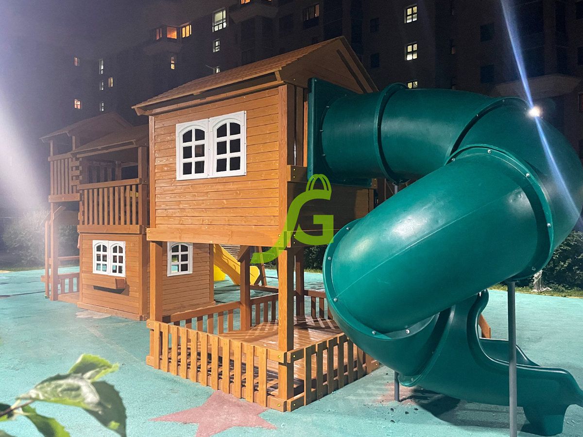 Просто огромный комплекс для детей красиво впишется в ландшафт загородного дома, его стильные башенки с белыми окошками на фоне сочной зелени украсят ваш сад. А самое главное, множество развлечений надолго отвлекут детей от вредных гаджетов, позволят выманить малышей-домоседов на свежий воздух. Разнообразные спортивные снаряды гарантированно будут воздействовать на все группы мышц мальчишек и девчонок. Ведь в площадке есть рукоход, скалодром, канат, лестницы и 4 горки для самых отважных. А для романтичных принцесс и творческих натур предусмотрены разного вида качели, доска для рисования, игра «крести-нолики» и игровой прилавок.