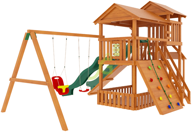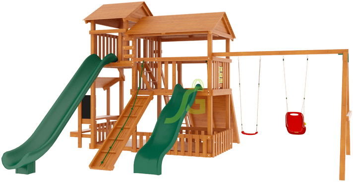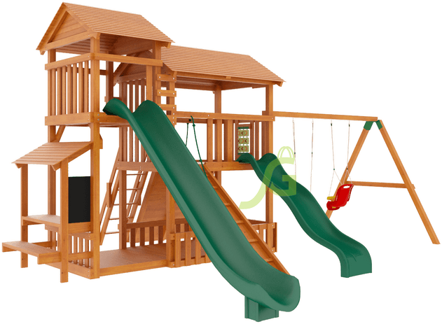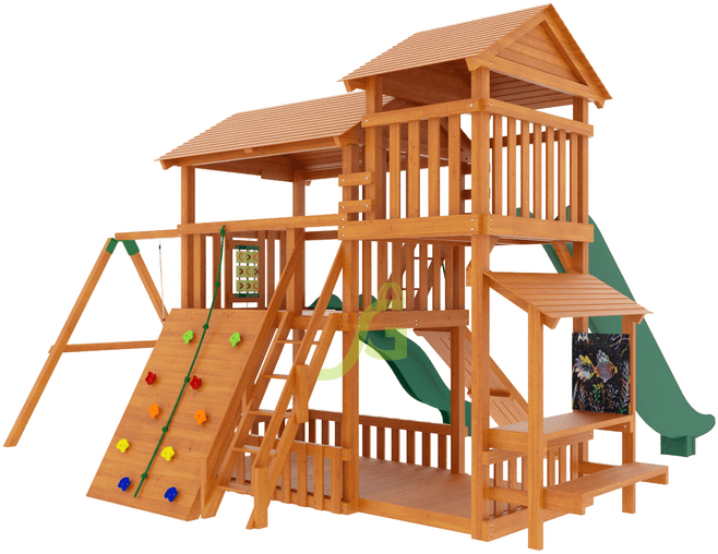 Специализированная детская деревянная площадка "IgraGrad Домик 3" полностью оборудовано спортивно-игровыми снарядами: двумя горками разных размеров, одиночными и кубельковыми качелями, скалодромом, рукоходом, доской для рисования, панелью для игры в «Крестики-Нолики».