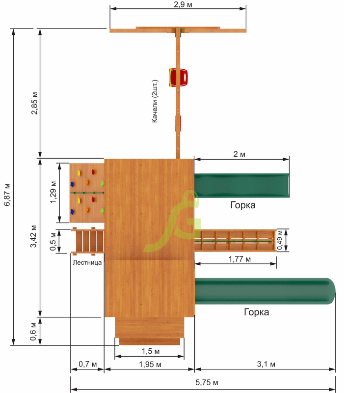 Обращаем Ваше внимание, что цвет установленной детской площадки может отличаться от представленных изображений на сайте. Специфика окраски нетоксичными пропитками допускает отклонения в цветовой гамме отгружаемых изделий вследствие различного цвета натурального природного сырья и естественных компонентов, используемых для производства площадок.