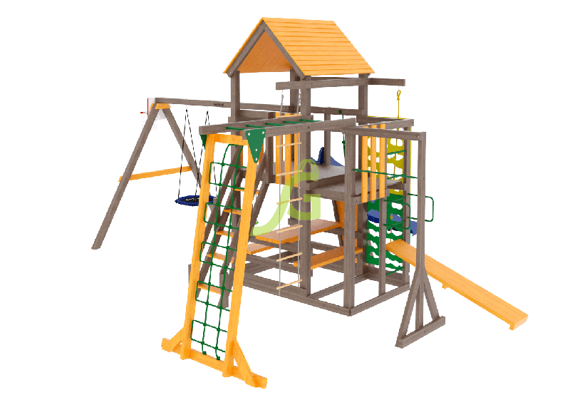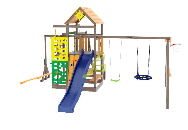 Конструкция спроектирована так, чтобы она проявляла к себе интерес. Поэтому данная детская площадка – не просто набор игровых элементов, а грамотно продуманное сооружение в виде башни с крышей, органично укомплектованной модулями для активных занятий. Здесь присутствуют удобные качели, рукоход, турник, волновая горка с бортами из прочного пластика, скалодром с канатом, лестницы, баскетбольное кольцо – всё, что требуется для развития мышц, тренировки выносливости, укрепления иммунной системы.