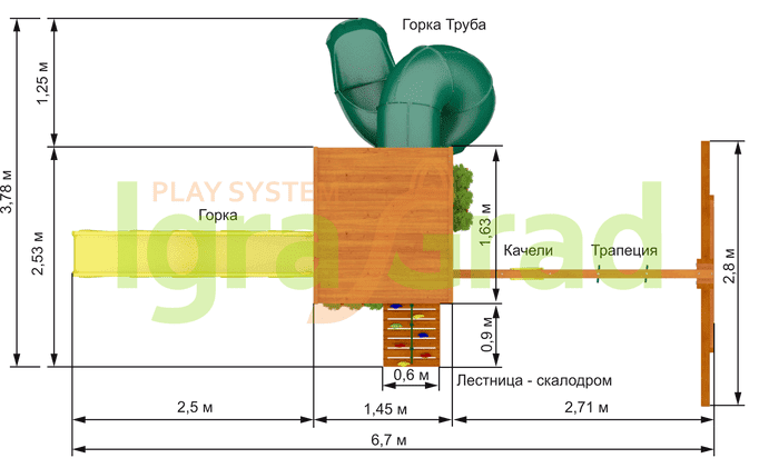 Детская площадка для дачи "Клубный домик с трубой" – разработка опытных инженеров компании IgraGrad. Одна из новейших моделей 2018 года. В комплекс входят закрытый двухуровневый деревянный домик, оснащенный дверью, крышей, пластиковым окошком. Трехметровая волновая горка и горка-труба с высоты 1.5 метров – излюбленный предмет на игровой зоне. Чтобы детки могли не просто интересно провести время на улице, но и с пользой для здоровья, конструкторы включили в конструкцию канат, деревянную лестницу-скалодром, трапецию с кольцами. У доски с игрой в "Крестики-нолики" ребенок может делать перерывы между активными тренировками и забегами.