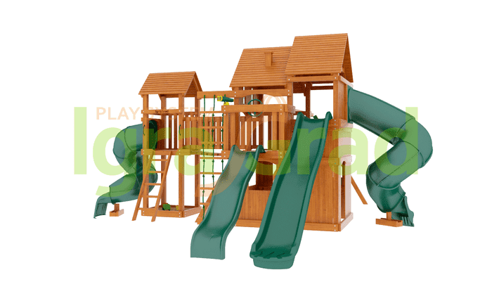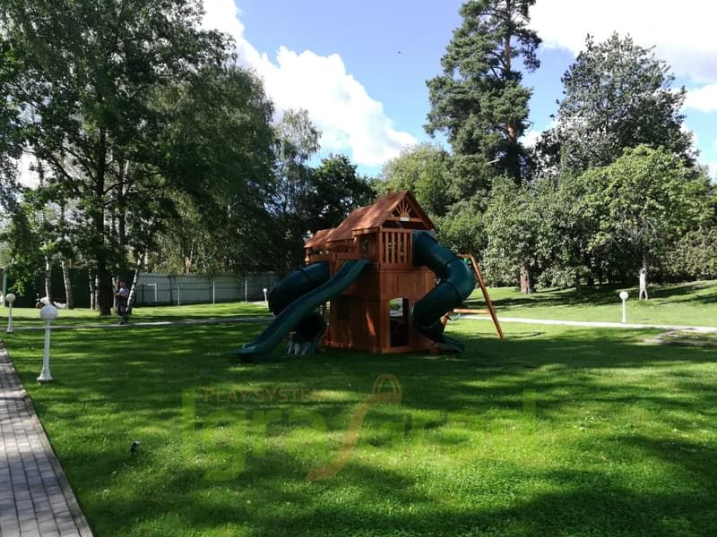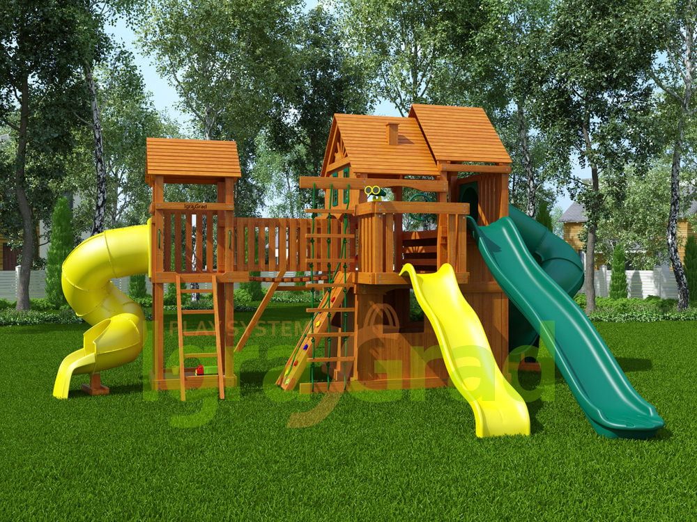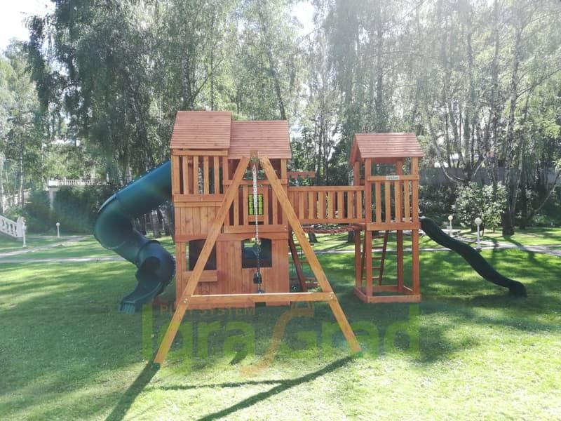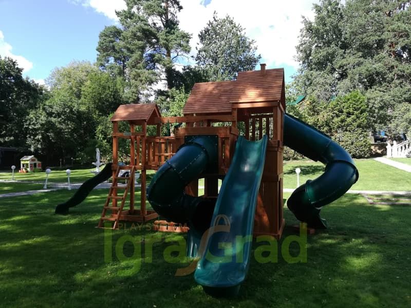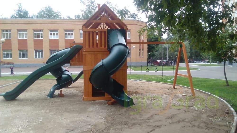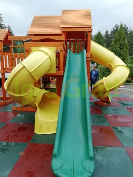 Можно кататься с горки, при этом дети не будут спорить, чья очередь скатываться. Ведь здесь присутствует сразу 4 разных горки: 2 волнообразные, 2 в виде трубы. Но возникает вопрос, как взобраться на желаемую горку? А вот это, самое интересное! Чтобы прокатиться с горки нужно сначала преодолевать путь препятствий. Но, всё зависит от предпочтений ребёнка, он может выбрать сложный или лёгкий путь, взбираясь только по деревянной лестнице или взбираясь по скалодрому, верёвочной лестнице.