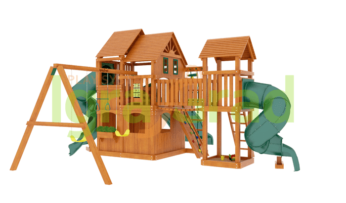 Дизайн детской деревянной площадки притягивает взгляд, соседские детишки не смогут пройти мимо и обязательно создадут компанию Вашему малышу. В этом нет ничего плохого, пусть ребёнок развивает в себе коммуникабельность и учится адаптироваться в любом обществе.