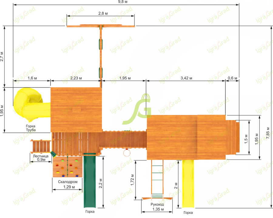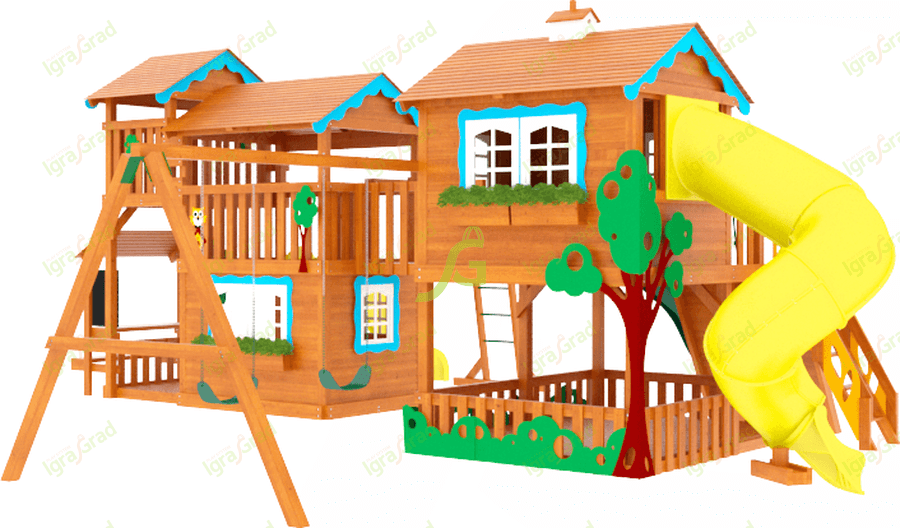 - - клеенный брус и обработанное специальными составами дерево устойчиво к внешним воздействиям и не боится влаги, поэтому комплекс будет радовать взрослых и детей безупречным внешним видом ни один сезон;