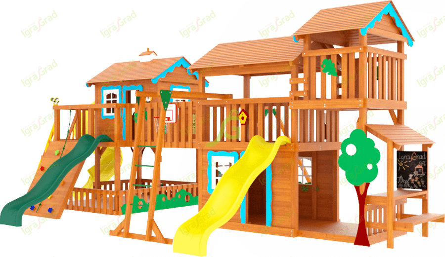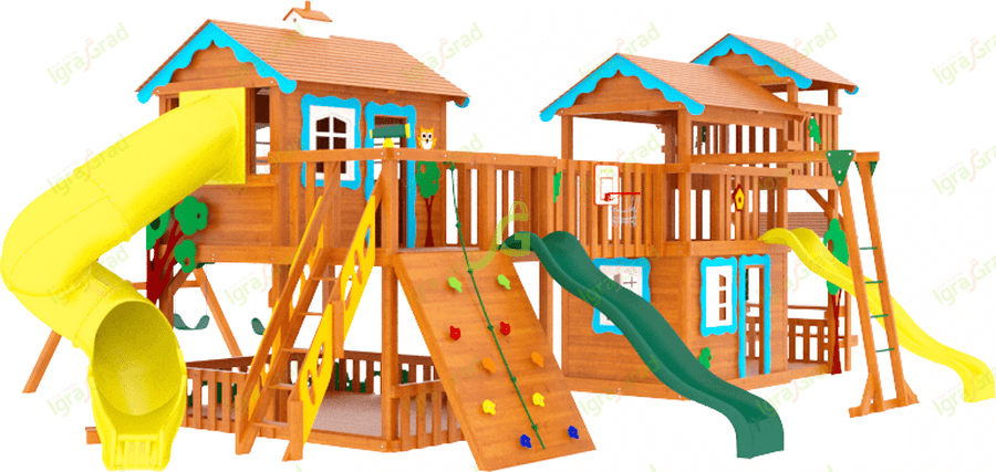 Просто огромный комплекс для детей красиво впишется в ландшафт загородного дома, его стильные башенки с белыми окошками на фоне сочной зелени украсят ваш сад. А самое главное, множество развлечений надолго отвлекут детей от вредных гаджетов, позволят выманить малышей-домоседов на свежий воздух. Разнообразные спортивные снаряды гарантированно будут воздействовать на все группы мышц мальчишек и девчонок. Ведь в площадке есть рукоход, скалодром, канат, лестницы и 4 горки для самых отважных. А для романтичных принцесс и творческих натур предусмотрены разного вида качели, доска для рисования, игра «крести-нолики» и игровой прилавок.