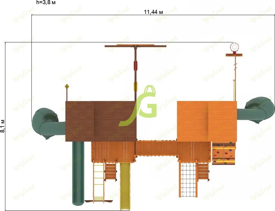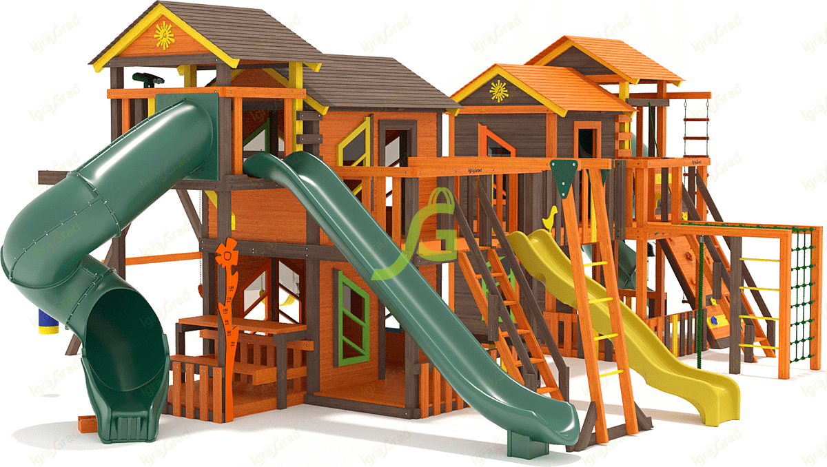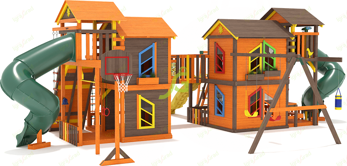 Грандиозный деревянный комплекс укомплектован сразу несколькими игровыми домиками, соединенными между собой переходами-мостиками. Это двухуровневые башни с домиками и верандами, с дизайнерскими окошками и четырьмя горками – волновыми разной длины и горками в виде труб.
