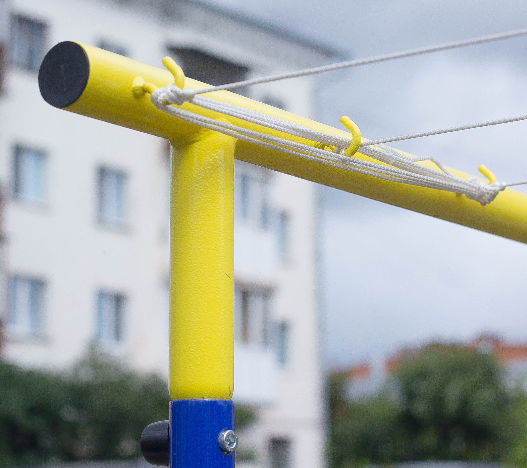 Стойка для сушки белья сине-желтого цвета. Может использоваться как турник.
