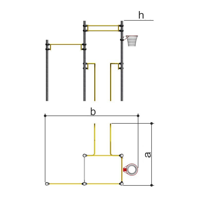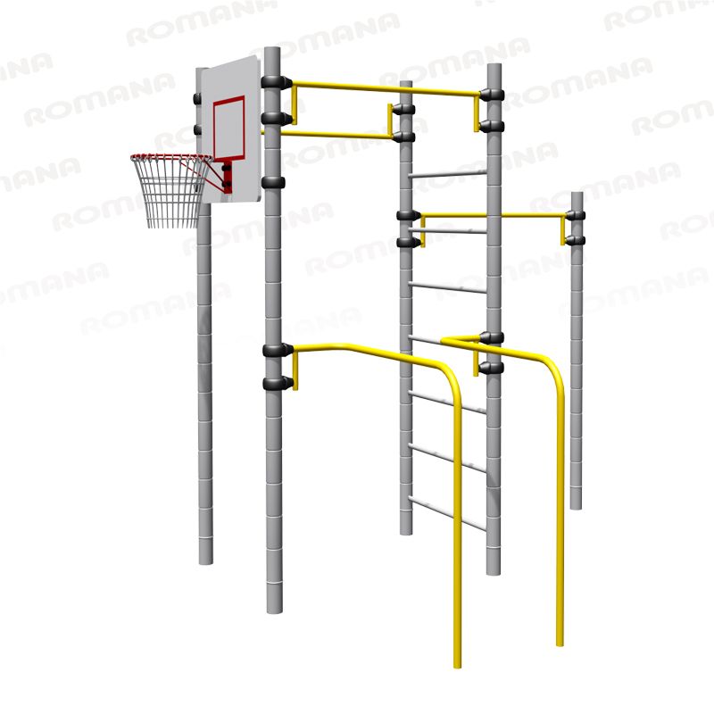 Представляет собой сборно-разборную прямоугольную конструкцию, состоящую из двух стоек и восьмиступенчатой лестницы, одна из стоек лестницы должна быть соединена с еще одной стойкой перекладиной, между второй стойкой лестницы и одной из стоек комплекса должны быть расположены брусья. Между стойками должно быть закреплено встраиваемое оборудование. Между первой и второй стойками должна быть расположен баскетбольный щит с кольцом и синтетической сеткой, между стойками лестницы и стойками комплекса две перекладины.