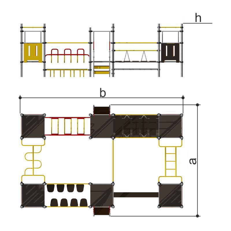 Спортивное оборудование для тематических игр и физического развития предназначено для детей в возрасте от 7 лет. Изделие представляет собой сборно-разборную каркасную конструкцию из металлических труб и фанерных элементов, установленную на забетонированные стойки. Изделие устанавливается на открытых уличных участках, находящихся под контролем ответственного лица – эксплуатанта. Установка должна проводится на ровной площадке, свободной от насаждений. В зоне безопасности должно быть ударопоглощающее покрытие (песок, древесные опилки) минимальной толщиной 300 мм. -
