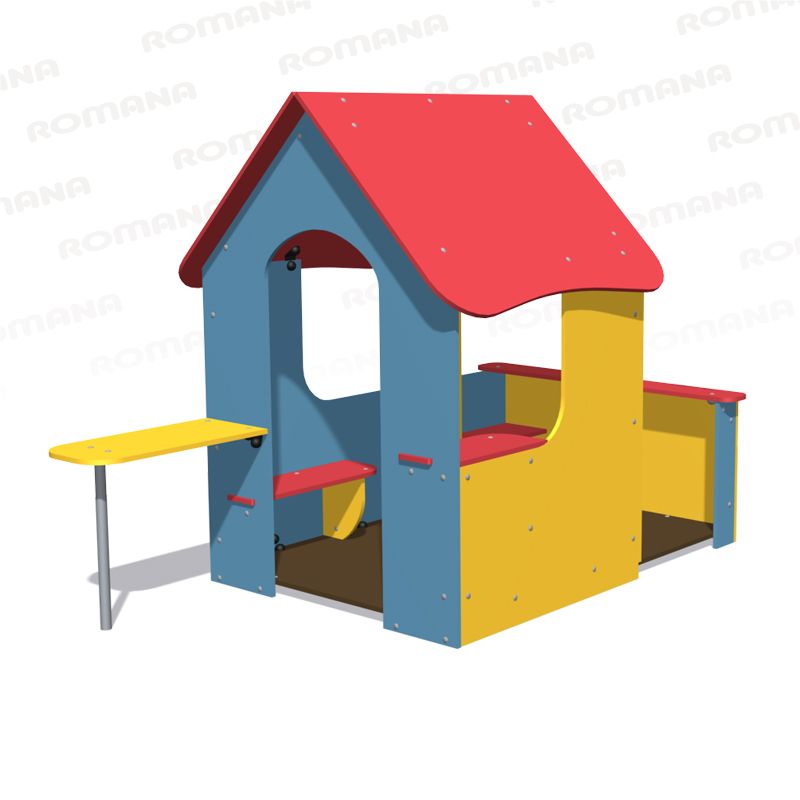 Домик со столиком представляет собой сборно-разборную конструкцию с полом из ламинированной фанеры ФОФ-Б-С1, Е1 с повышенными свойствами по водо - и износостойкости с антискользящим покрытием толщиной не менее 18 мм. Домик имеет вход и выход. С одной стороны домика расположен выносной столик на опоре. С другой стороны домика расположена открытая площадка без крыши, к одной стенке которой прикреплена скамеечка, к другой стенке – полочка. Крыша домика представляет собой двухскатную конструкцию, скаты выполнены из водостойкой фанеры толщиной не менее 15 мм.