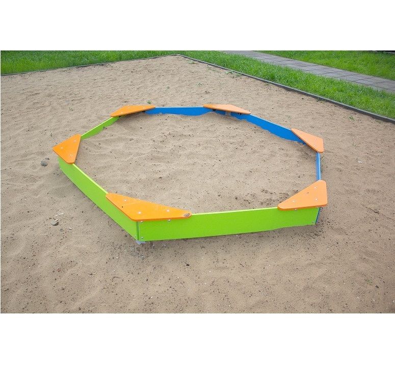 Песочница для детей от 3 до 7 лет. Может эксплуатироваться круглогодично во всех климатических зонах. Изделие представляет собой разноцветную песочницу размерами не менее 2850*2500 мм, состоящую из не менее шести металлических стоек, которые должны бетонироваться. -