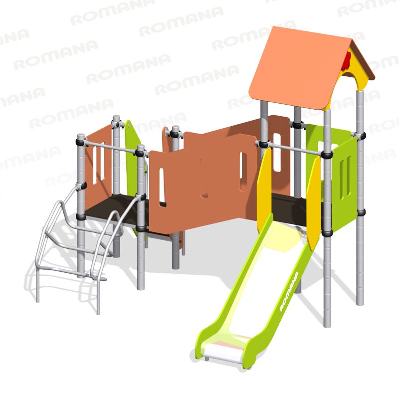 Детская площадка «Romana 104.18.00» с домиком-горкой, горкой и переходом, подходит для небольших площадок на территории детских садов и дворовых площадок, на дачном участке. Позволяет детям развивать координацию и ловкость.