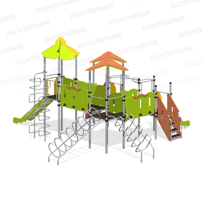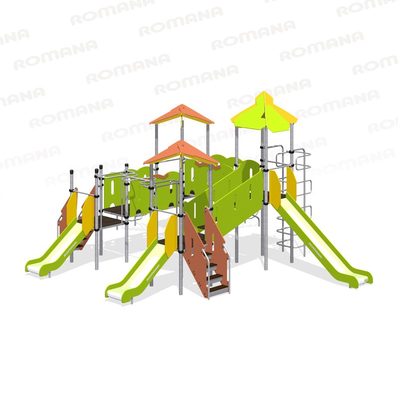 Детская площадка «Romana 101.31.00» большой комплекс с домиками-горками, различными лестницами, турниками, переходами. Хорошо развивает координацию и ловкость у детей, укрепляет мышцы. Подходит для больших детских игровых площадок.