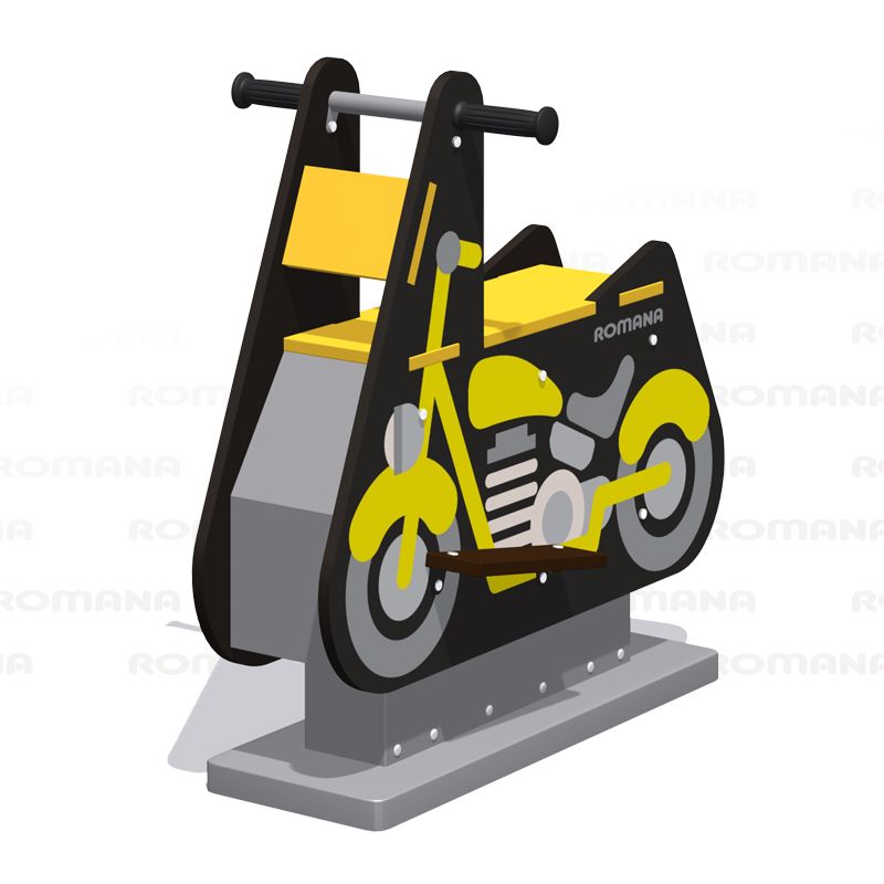 Качалка для тематических игр, предназначена для детей в возрасте от 2 лет. На фигурную вставку при помощи УФ-печати нанесено изображение в тематике «мотоцикл». Конструкция качалки предоставляет возможность качаться пользователю по оси «вперед-назад». Изделие приходит в движение за счет переноса веса ребенка - совершения раскачивающих движений «назад-вперед». Платформа обеспечивает плавное легкое качание, без ударов и усилий. -