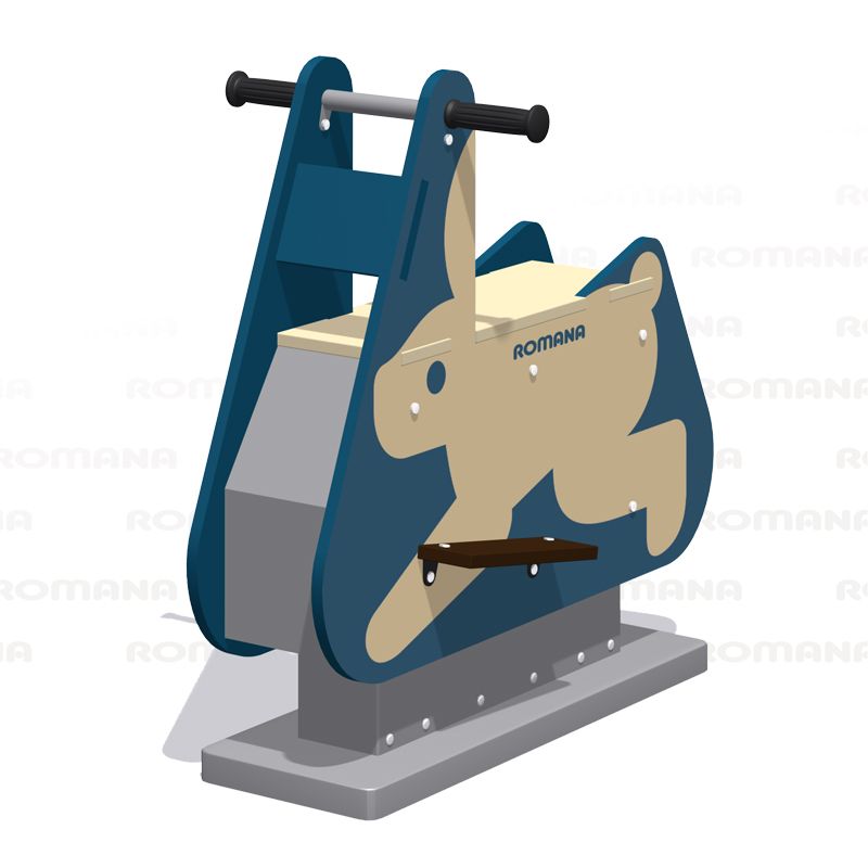 Качалка для тематических игр, предназначена для детей в возрасте от 2 лет. На фигурную вставку при помощи УФ-печати нанесено изображение в тематике «заяц». Конструкция качалки предоставляет возможность качаться пользователю по оси «вперед-назад». Изделие приходит в движение за счет переноса веса ребенка - совершения раскачивающих движений «назад-вперед». Платформа обеспечивает плавное легкое качание, без ударов и усилий. -