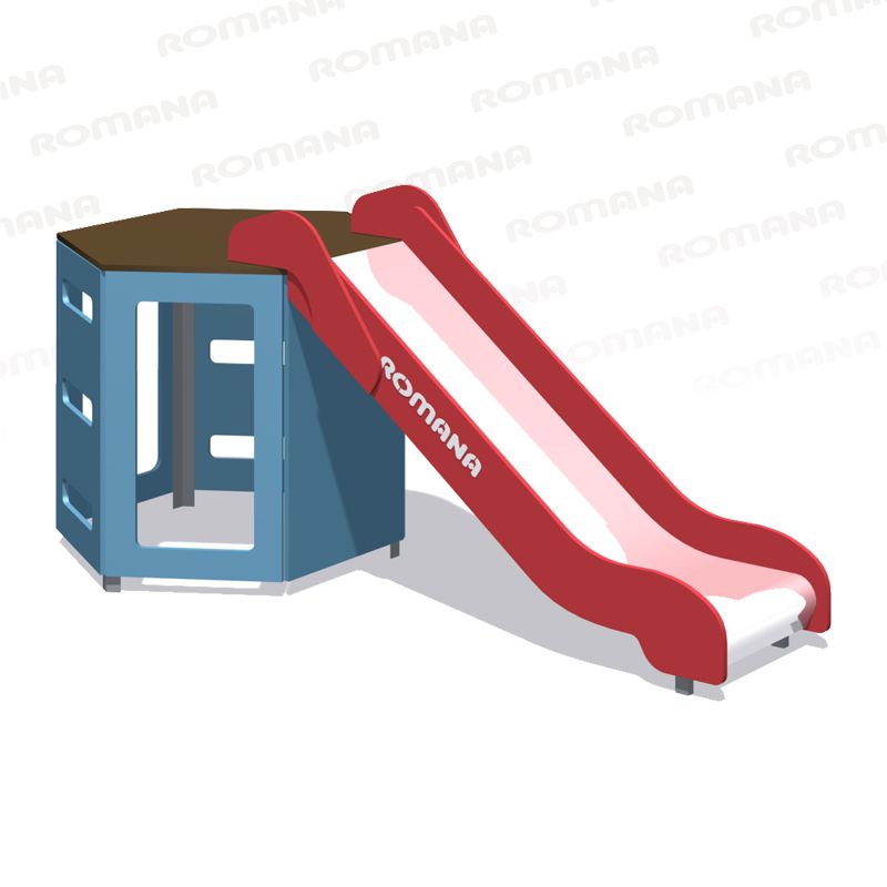 Игровой модуль для тематических игр и физического развития предназначен для детей в возрасте от 4 до 12 лет. Изделие должно представлять собой устойчивую конструкцию, обеспечивающую безопасные условия для занятий на открытом воздухе. Конструкция должна обладать высокой ударопрочностью и виброустойчивостью.В сборе представляет собой конструкцию в виде шестиугольного каркаса из панелей с отверстиями, скрепленную уголками и грунтозацепами, с установленной фанерной крышей и присоединенной горкой высотой ската 950 мм.