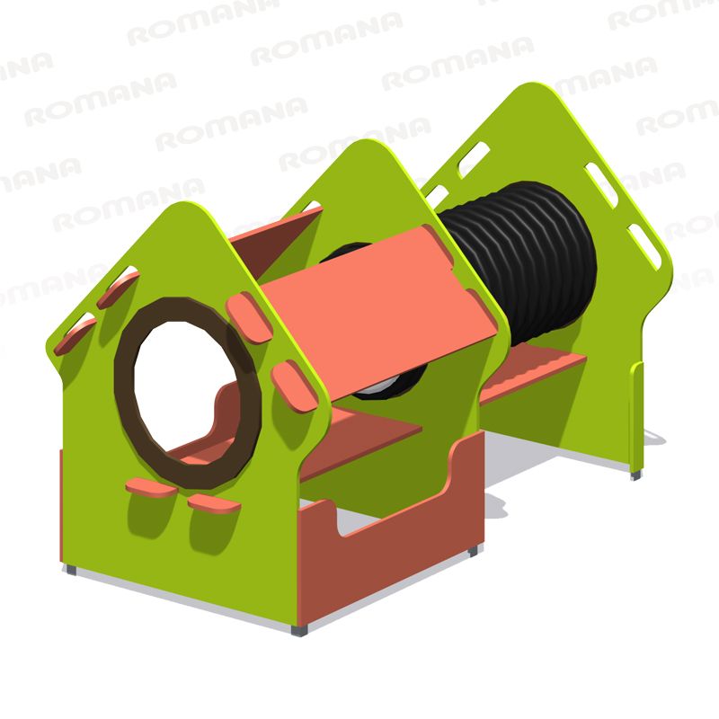 Игровой модуль для тематических игр и физического развития предназначен для детей в возрасте от 4 до 8 лет. Изделие должно представлять собой устойчивую конструкцию, обеспечивающую безопасные условия для занятий на открытом воздухе. Конструкция должна обладать высокой ударопрочностью и виброустойчивостью. В сборе представляет собой конструкцию в виде домика с отверстиями лазами и гофрированной трубой. Изделие устанавливается на открытых уличных участках, находящихся под контролем ответственного лица – эксплуатанта. Установка Изделия должна проводится на ровной площадке, свободной от насаждений. В зоне приземления должно быть ударопоглощающее покрытие (песок, древесные опилки) минимальной толщиной 300 мм. -