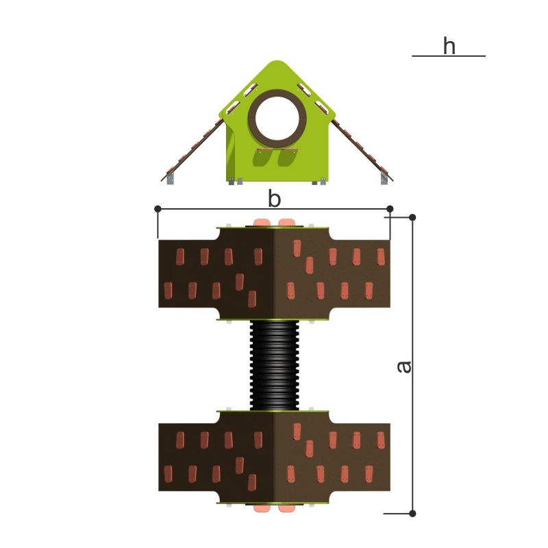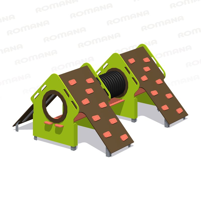 Игровой модуль для тематических игр и физического развития предназначен для детей в возрасте от 4 до 8 лет. Изделие должно представлять собой устойчивую конструкцию, обеспечивающую безопасные условия для занятий на открытом воздухе. Конструкция должна обладать высокой ударопрочностью и виброустойчивостью. В сборе представляет собой конструкцию в виде двух домиков соединенных гофрированной трубой, с отверстиями лазами и надстроенными над ними лазами наклонными. Изделие устанавливается на открытых уличных участках, находящихся под контролем ответственного лица – эксплуатанта. Установка Изделия должна проводится на ровной площадке, свободной от насаждений. В зоне приземления должно быть ударопоглощающее покрытие (песок, древесные опилки) минимальной толщиной 300 мм. -