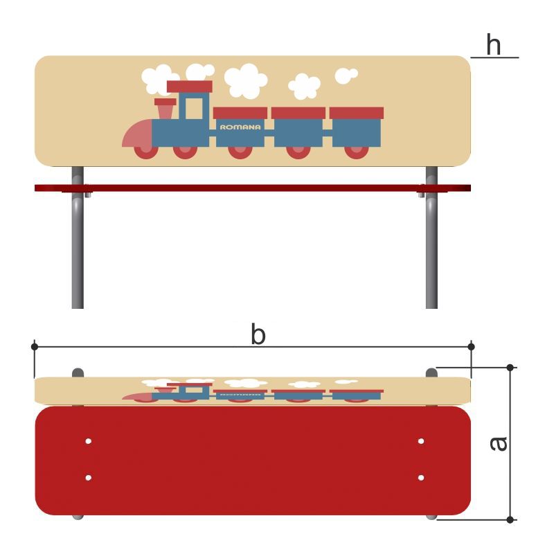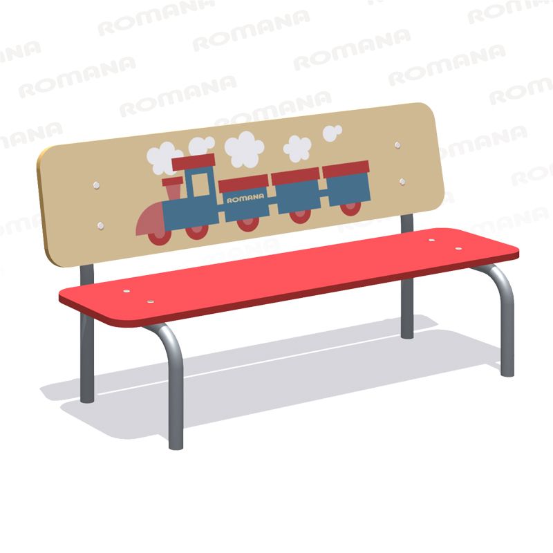 Скамья детская «Romana 302.09.00» двухцветная детская скамейка со спинкой для детских площадок, спортивных городков, детских садов. Спинка изделия декорирована рисунком «Поезд/день», выполненным «УФ»-печатью.