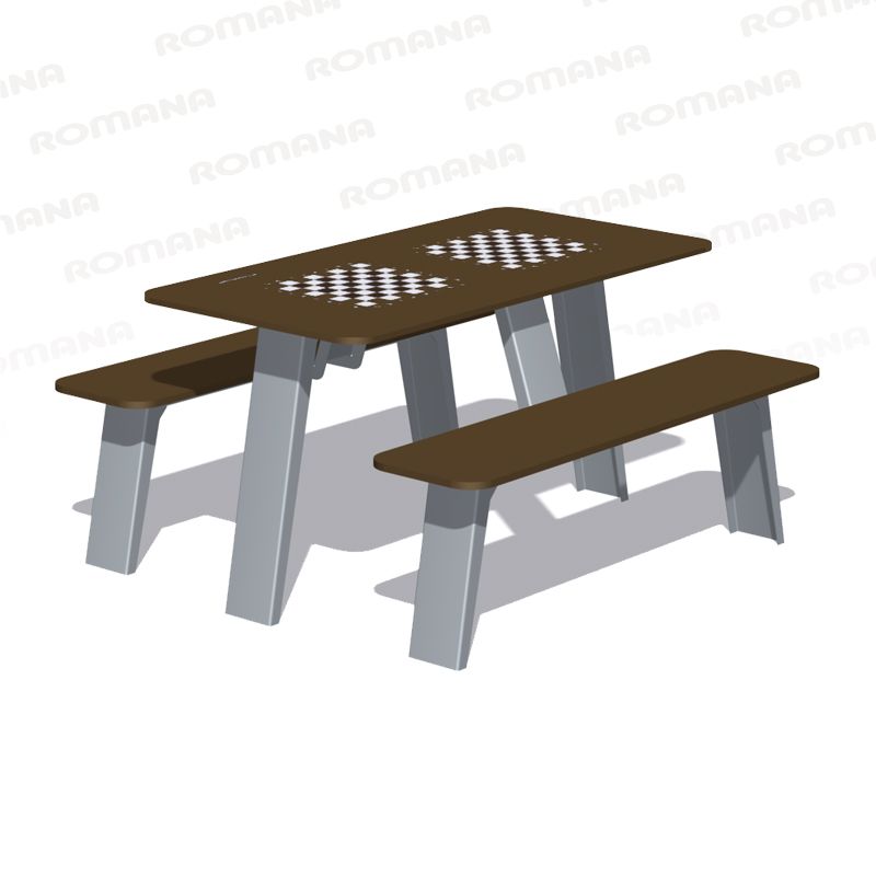 Стол со скамьями предназначен для размещения на территории парков, дворовых территориях и мест общественного отдыха с целью организации досуга. Может эксплуатироваться круглогодично во всех климатических зонах. На столешницу нанесен принт «шахматная доска» общим габаритом 480х480 мм, методом УФ-печати. -
