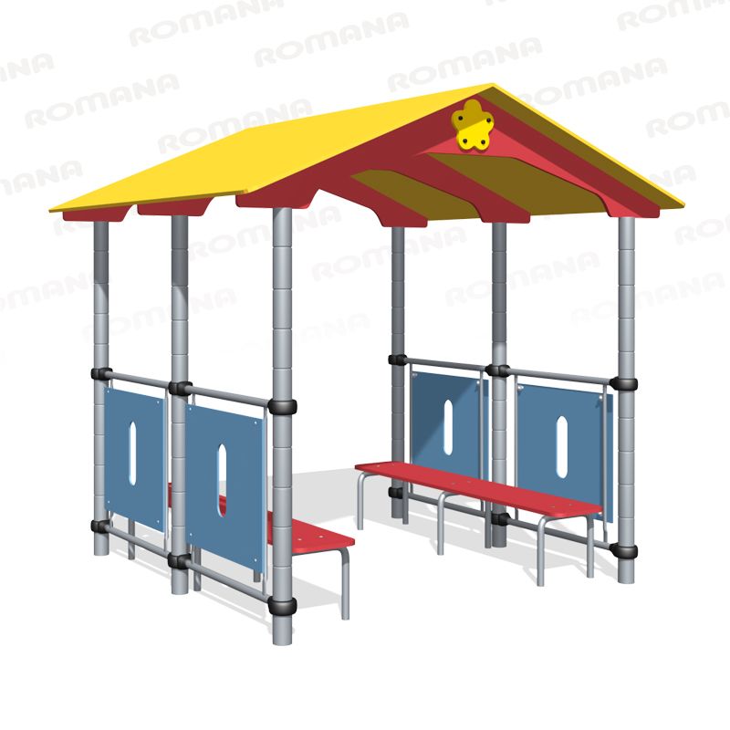 Беседка представляет собой сборно-разборную прямоугольную конструкцию с двумя входами, с ограждениями и двумя сидениями, расположенными по двум сторонам беседки. Входы расположены с двух противоположных сторон беседки. Двускатная крыша беседки разборная и имеет наличники.