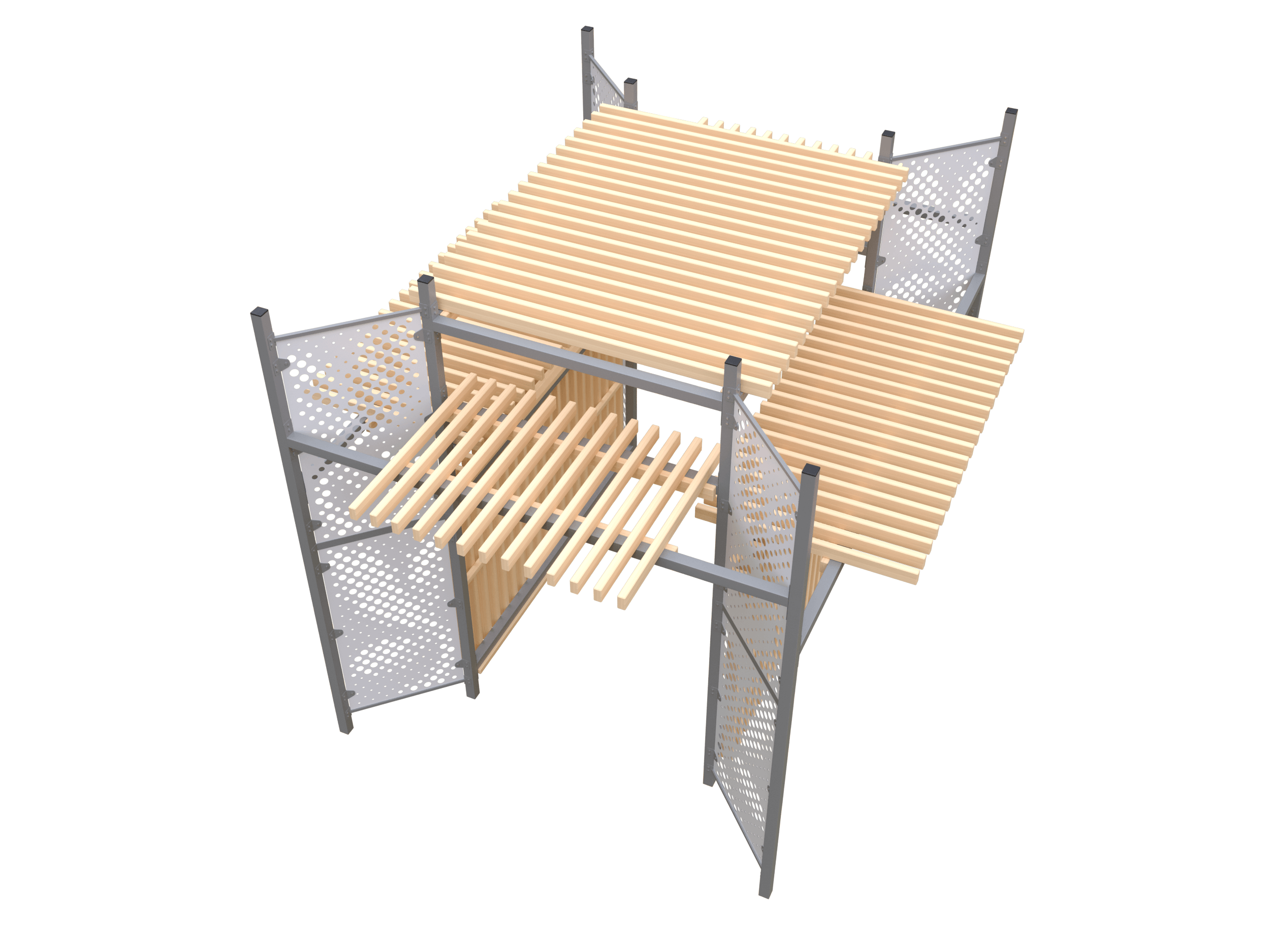Навес классической квадратной формы с крышей из деревянных решеток, с горизонтальными тентами сверху на каждой из 4 сторон, под которыми удобно поставить садовые скамейки, с металлическими перегородками, идеально подходящими для вьющихся растений и цветов — это не только полноценная зона отдыха, но и украшение любой территории.