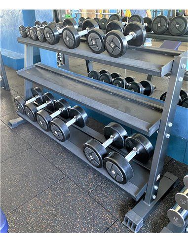 Подставка трехярусная AV603/80 - это компактный вариант профессиональной подставки для хранения гантельного ряда в тренажерном зале или дома. Подставка предназначена для хранения набора гантелей как классической формы, так и гексагональных гантельных рядов с числом гантель 20 штук.