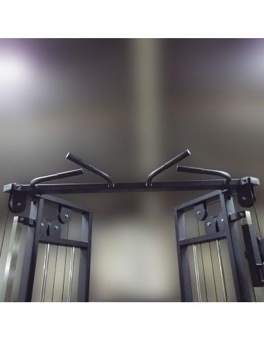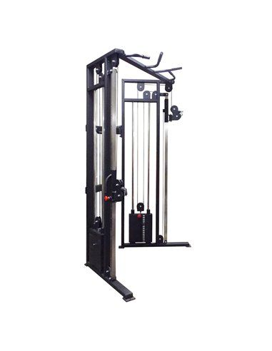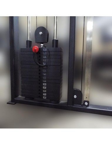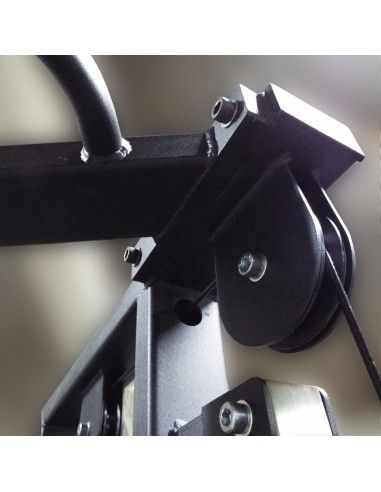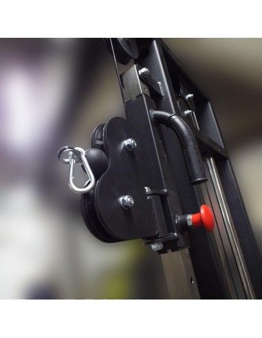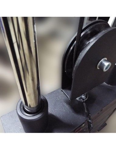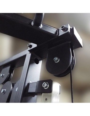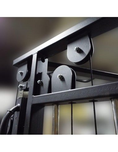 - Нагрузка с грузоблоков на рабочие рукоятки, ремни или манжеты передается через вращающиеся в вертикальной плоскости и перемещающиеся по направляющим вверх и вниз роликовые блоки посредством стальных тросов толщиной 5 мм в чёрной ПВХ-оболочке (максимальная нагрузка 800 кг).