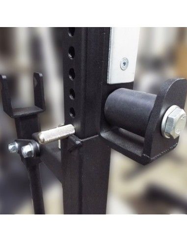 - Для удержания штанги на стойках вместо стальных крюков применён специальный рычажный механизм из нержавеющей стали, который позволяет поднимать и опускать штангу весом до 600 кг вместе дисками одному человеку.