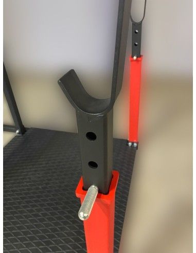- Для удержания штанги тренажер оснащен ловушками для грифа из стальной полосы толщиной 5 мм.