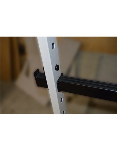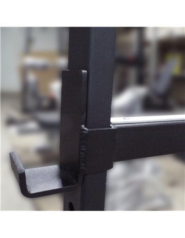 - Стойки тренажёра оборудованы стальными крюками для штанги, положение которых можно регулировать по высоте в зависимости от выполняемого упражнения и роста спортсмена.