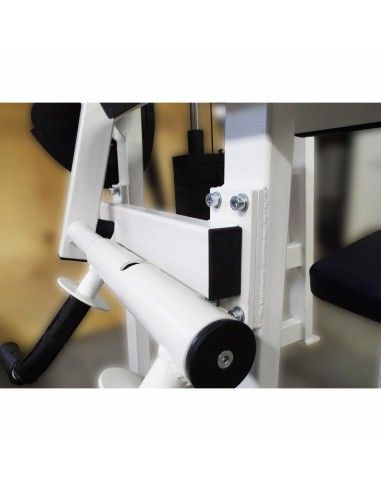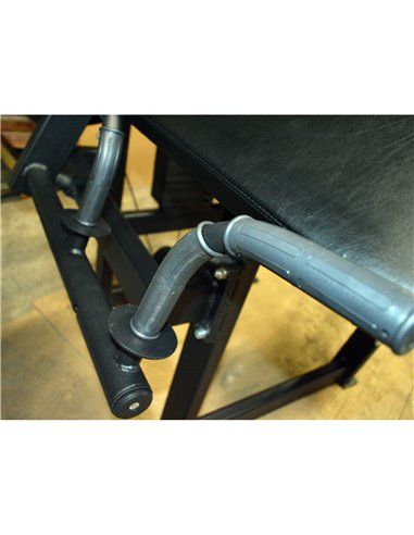 - Тщательно отрегулированная система шкивов, копира и балансира при помощи 5-миллиметрового стального троса в оболочке из ПВХ равномерно передаёт рабочий вес с грузоблока на V-образную обрезиненную рукоятку. Траектория движения рукоятки также анатомически выверена. Шарнирно закреплённая на рычаге V-образная рукоятка не требует регулировки.
