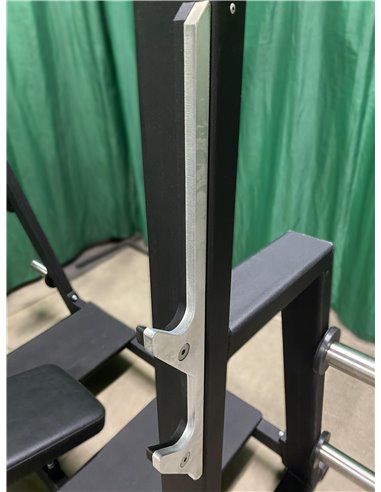 - Стойки тренажёра оборудованы стальными крюками для штанги, выполненными в виде гребёнки, и накопителями из нержавеющей стали для хранения дисков для штанги.