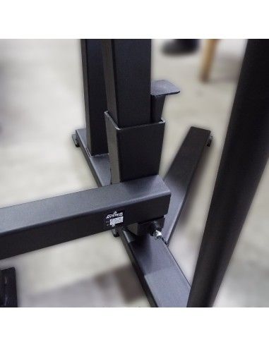 Отличительной особенностью тренажёра Стойка для пауэрлифтинга с тремя скамьями AV132/80 является наличие специального механизма (домкратов), который позволяет изменять положение штанги в вертикальной плоскости, не снимая со штанги дисков. Механизм рассчитан на нагрузку до 600 кг.