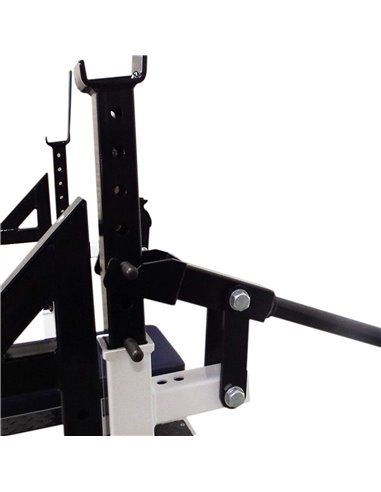 - Для удержания штанги на стойках вместо стальных крюков применён специальный рычажный механизм из нержавеющей стали, который позволяет поднимать и опускать штангу весом до 600 кг вместе дисками одному человеку.