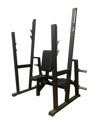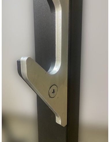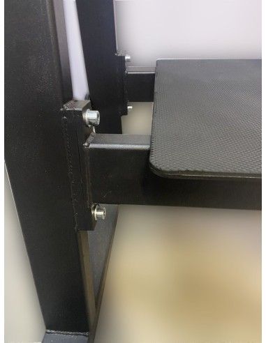 - Стойки тренажёра оборудованы стальными крюками для штанги, выполненными в виде гребёнки, и накопителями из нержавеющей стали для хранения дисков для штанги.