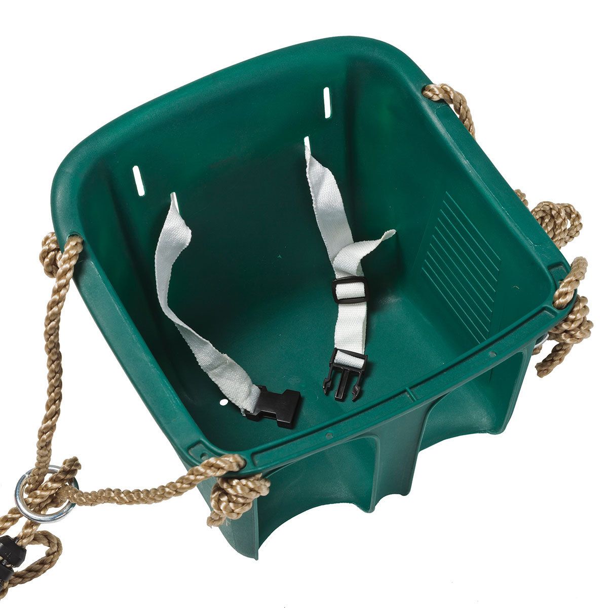 Детское сиденье жесткой формы производства КВТ имеет узлы внизу сиденья, которые обеспечивают дополнительную стабильность. Узлы сплавлены между собой. Кольца и восьмерки изготовлены из оцинкованной стали. Уэлды на веревке изготовлены из черного пластика.