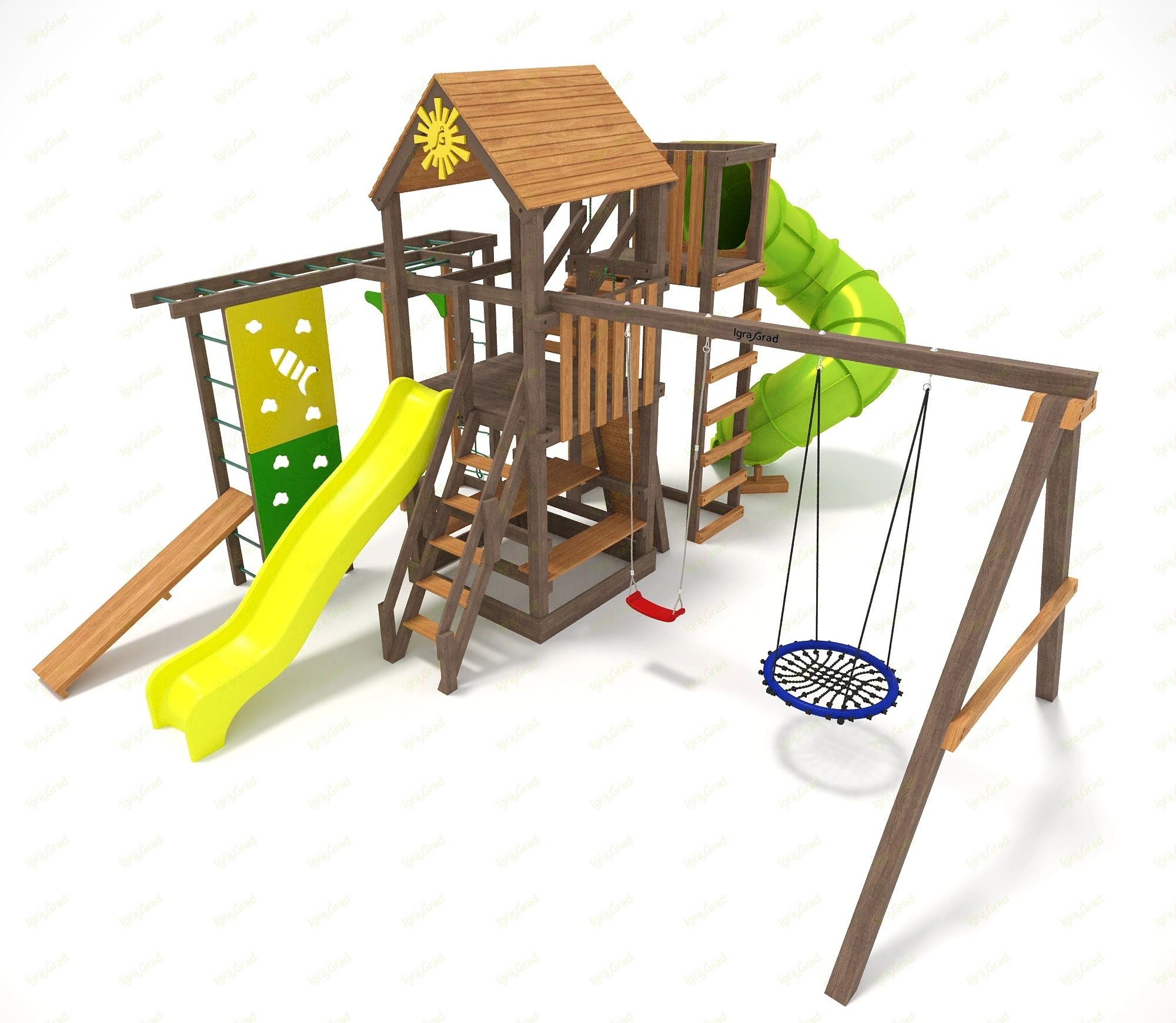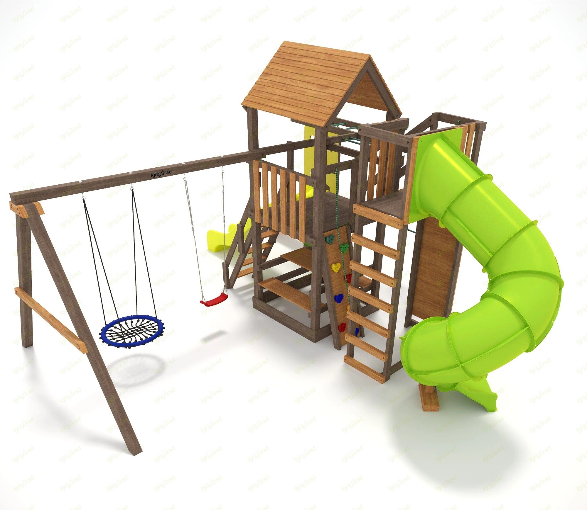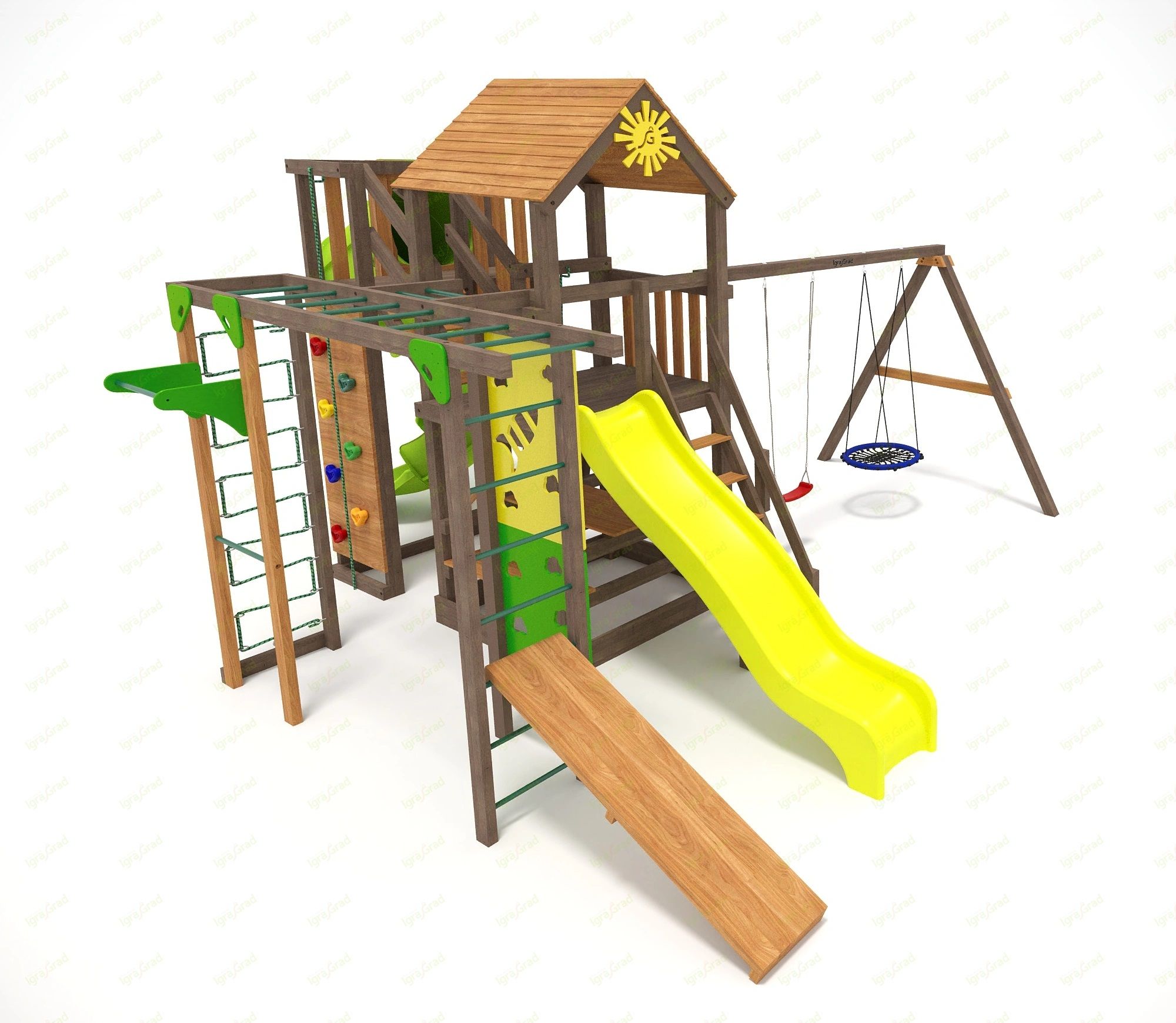 Обращаем Ваше внимание, что цвет установленной детской площадки может отличаться от представленных изображений на сайте. Специфика окраски нетоксичными пропитками допускает отклонения в цветовой гамме отгружаемых изделий вследствие различного цвета натурального природного сырья и естественных компонентов, используемых для производства площадок.