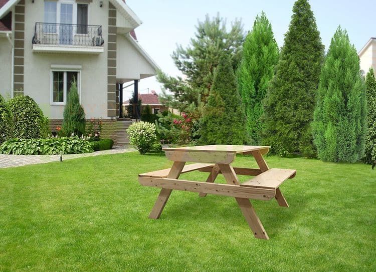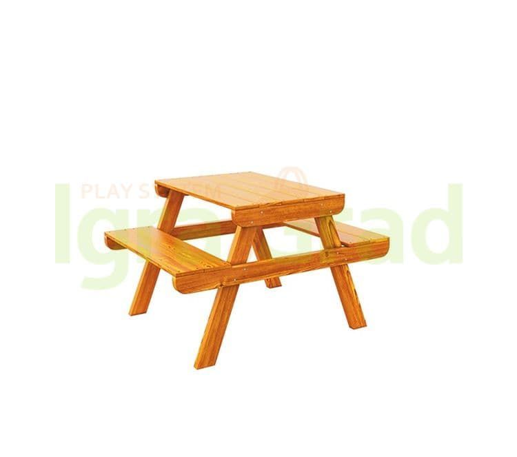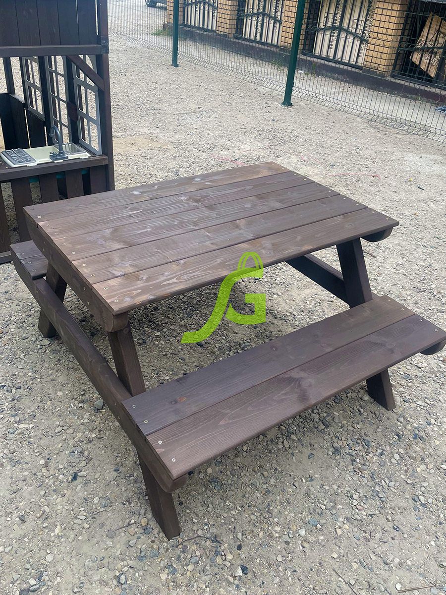 Цельная конструкция, состоящая из широкой столешницы, двух скамеек, крепящихся к устойчивым ножкам с помощью опор и саморезов. Аккуратно закруглённые опоры, тщательно отшлифованная древесина и нетоксичная гипоаллергенная пропитка гарантируют безопасность использования.