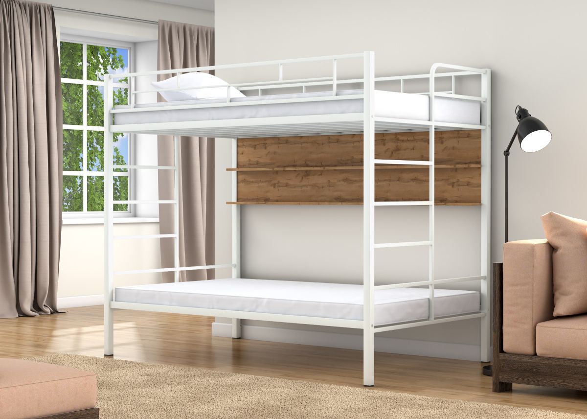 Двухъярусная кровать Валенсия 120 Твист Белый полка дуб ватан от Фабрики мебели 4 Сезона. Каркас выполнен из прочного металла, покрытого порошковой краской. Основание под матрас сварное, ламели металлические профиль 30х15 мм. Каждый ярус выдержит нагрузку до 150 кг. Ножки кровати имеют пластиковые заглушки. Лестницы сварные, расположены с обеих сторон с торцов кровати. В комплект входит навесная полка из ЛДСП 16 мм, крепится к основанию кровати. При необходимости можно доукомплектовать выкатными ящиками для белья.