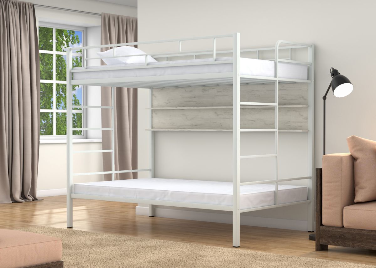 Двухъярусная кровать Валенсия 120 Твист Белая полка крафт белый от Фабрики мебели 4 Сезона. Каркас выполнен из прочного металла, покрытого порошковой краской. Основание под матрас сварное, ламели металлические профиль 30х15 мм. Каждый ярус выдержит нагрузку до 150 кг. Ножки кровати имеют пластиковые заглушки. Лестницы сварные, расположены с обеих сторон с торцов кровати. В комплект входит навесная полка из ЛДСП 16 мм, крепится к основанию кровати. При необходимости можно доукомплектовать выкатными ящиками для белья.