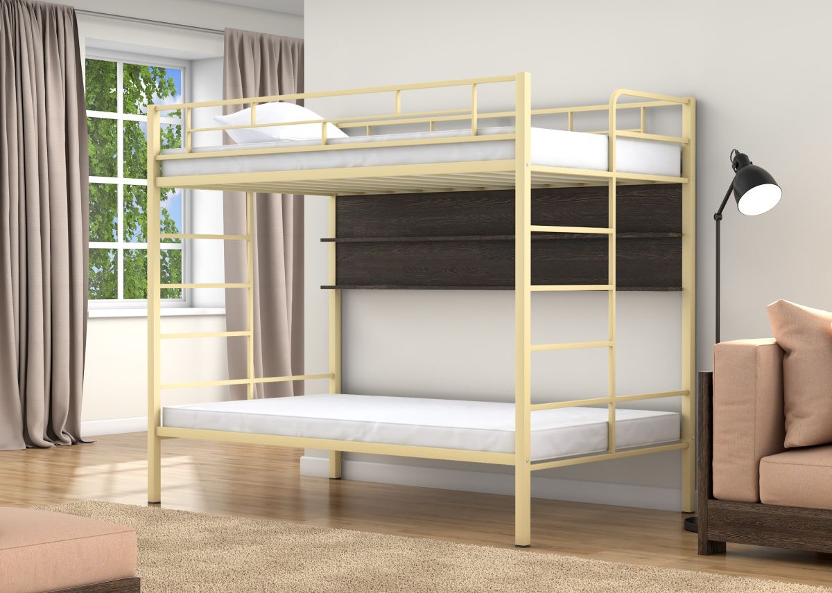 Двухъярусная кровать Валенсия 120 Твист Слоновая кость полка венге от Фабрики мебели 4 Сезона. Каркас выполнен из прочного металла, покрытого порошковой краской. Основание под матрас сварное, ламели металлические профиль 30х15 мм. Каждый ярус выдержит нагрузку до 150 кг. Ножки кровати имеют пластиковые заглушки. Лестницы сварные, расположены с обеих сторон с торцов кровати. В комплект входит навесная полка из ЛДСП 16 мм, крепится к основанию кровати. При необходимости можно доукомплектовать выкатными ящиками для белья.
