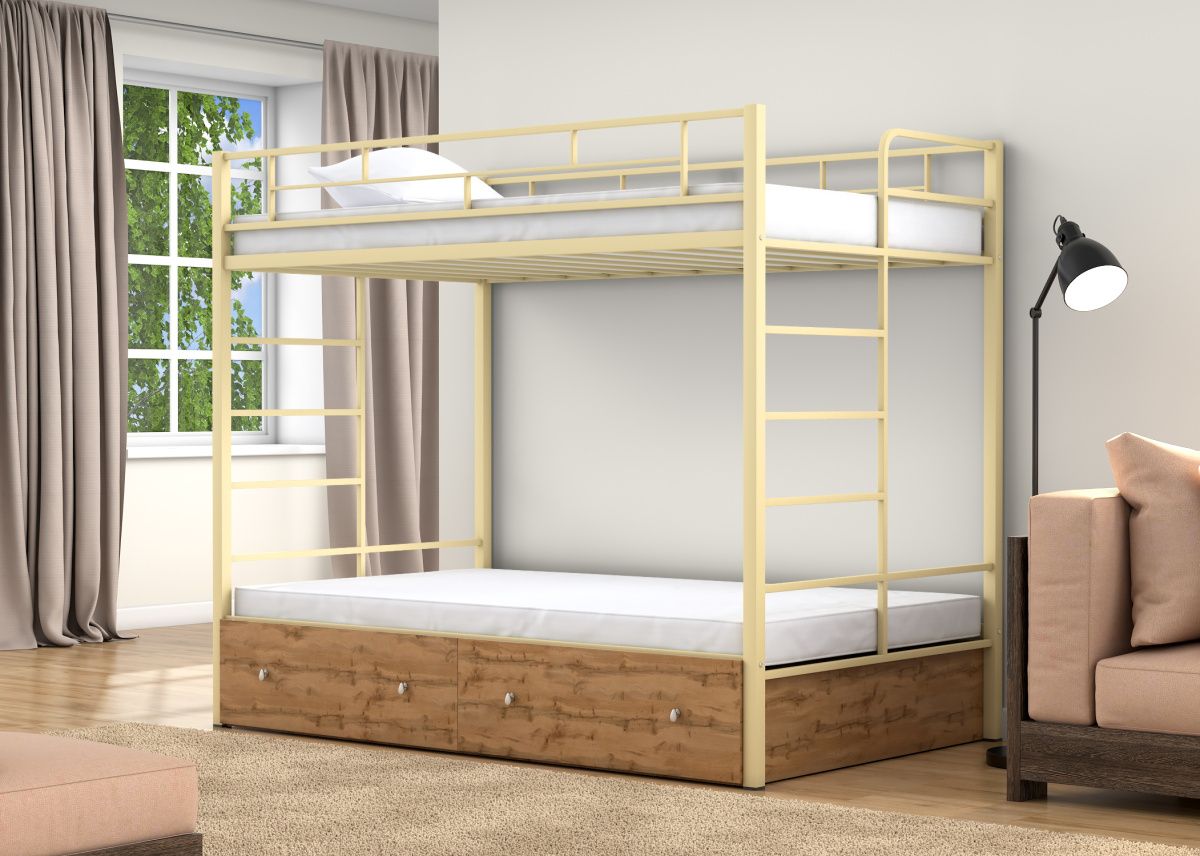 Двухъярусная кровать Валенсия 120 Твист Слоновая кость ящики дуб ватан от Фабрики мебели 4 Сезона. Каркас выполнен из прочного металла, покрытого порошковой краской. Основание под матрас сварное, ламели металлические профиль 30х15 мм. Каждый ярус выдержит нагрузку до 150 кг. Ножки кровати имеют пластиковые заглушки. Лестницы сварные, расположены с обеих сторон с торцов кровати. В комплект входят два выкатных ящика из ЛДСП 16 мм, без направляющих, на пластиковых колесах. При необходимости можно доукомплектовать навесной полкой над нижним ярусом.