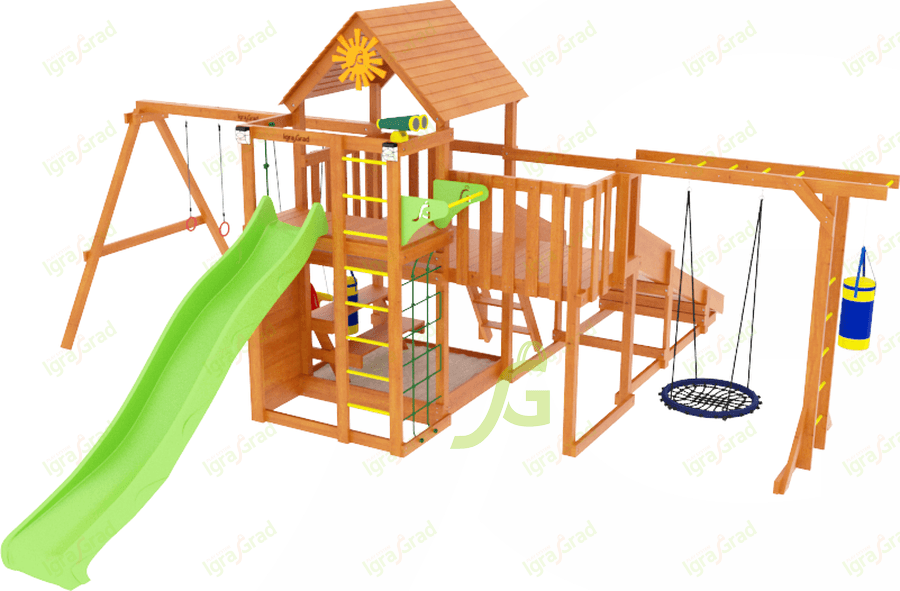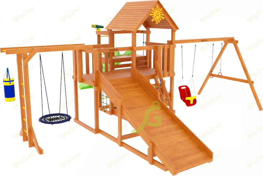 Детский городок для дачи включает: - конструкция двухуровневой башни из клееного бруса 70х70 мм; - модуль Snow Fox для Крафт Pro (зимняя горка); - деревянная крыша; - волновая горка 3,0 м; - деревянная лестница с перилами; - рукоход; - столик-лавочка; - канат; - качельный модуль; - сетка для восхождения; - боксерская груша с перчатками; - качели гнездо-паутинка IgraGrad 60; - турник; - гимнастические кольца; - декоративный элемент "Солнышко"; - деревянная лестница; - скалодром; - баскетбольное кольцо; - качельный модуль; - пластиковые кубельковые качели (1 шт.); - комплект фурнитуры; - руководство по сборке.