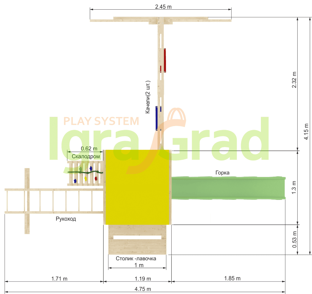 Обращаем Ваше внимание, что цвет установленной детской площадки может отличаться от представленных изображений на сайте. Специфика окраски нетоксичными пропитками допускает отклонения в цветовой гамме отгружаемых изделий вследствие различного цвета натурального природного сырья и естественных компонентов, используемых для производства площадок.